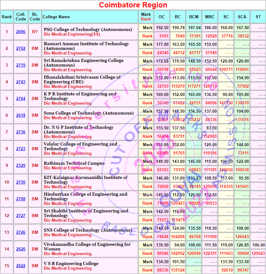 Anna University Cut off Marks 2023 based on tnea 2022 admission (Last but 1 year) Branch wise