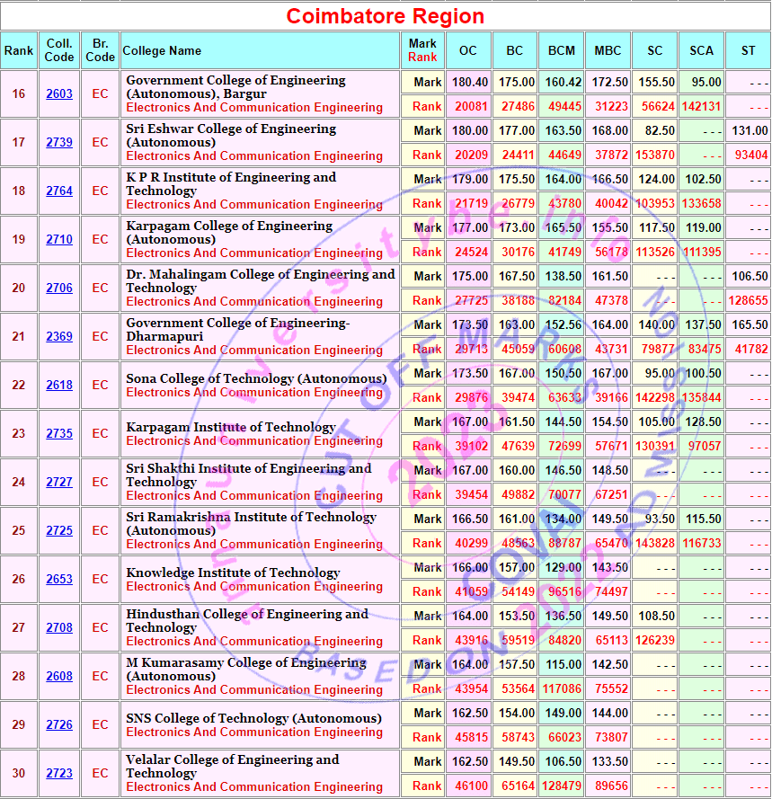 Anna University Cut off Marks 2023 based on tnea 2022 admission (Last but 1 year) Branch wise