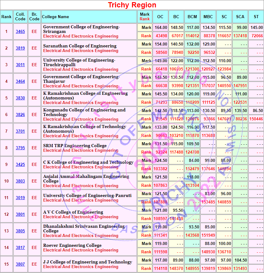 Anna University Cut off Marks 2023 based on tnea 2022 admission (Last but 1 year) Branch wise